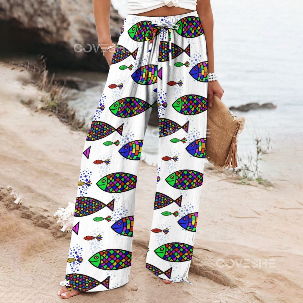 Women's Wide Leg Casual Colorful Geometric Fish Printed Pants