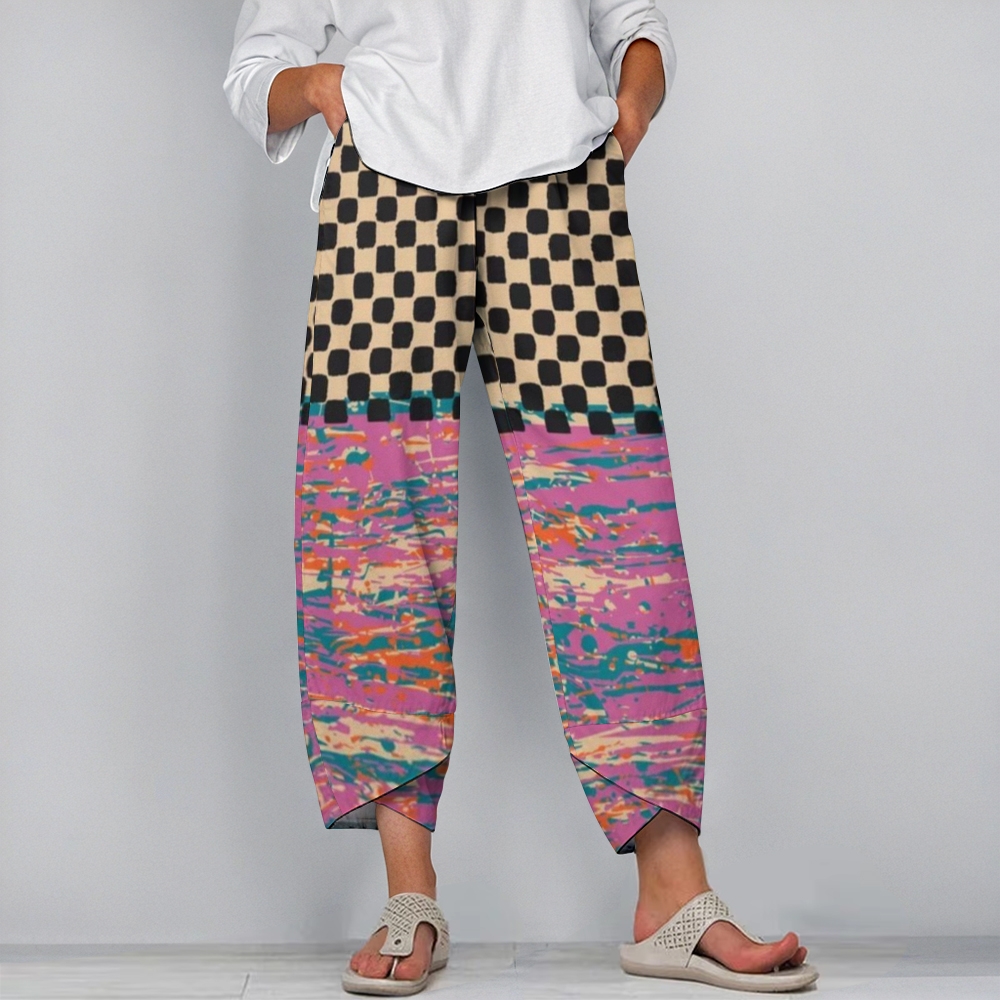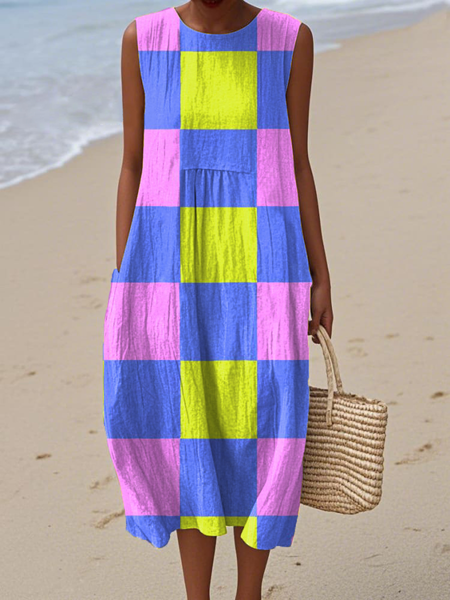 Women's Colorful Plaid Painting Art Print Sleeveless Cotton Pocket Wrap Dress
