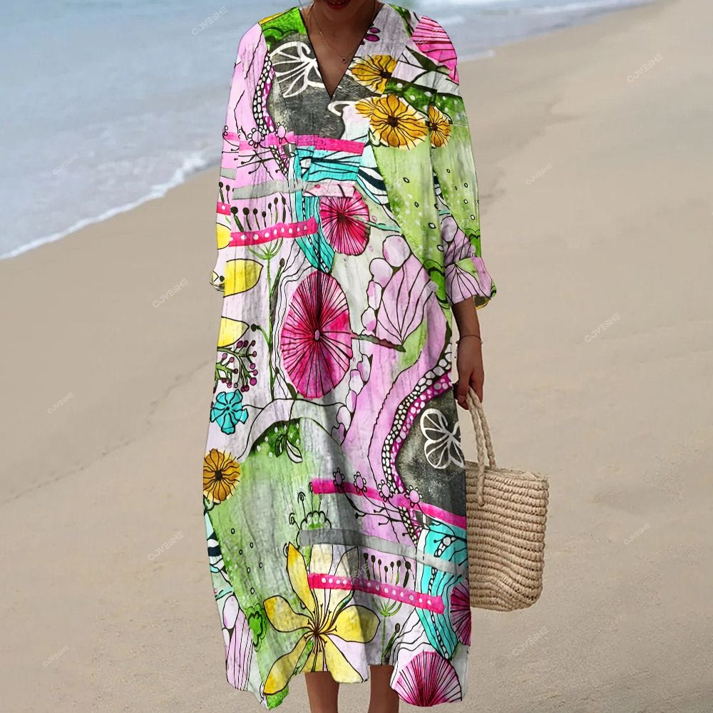 Women's Vintage Art Flower Print Sleeveless Cotton Pocket Wrap Dress