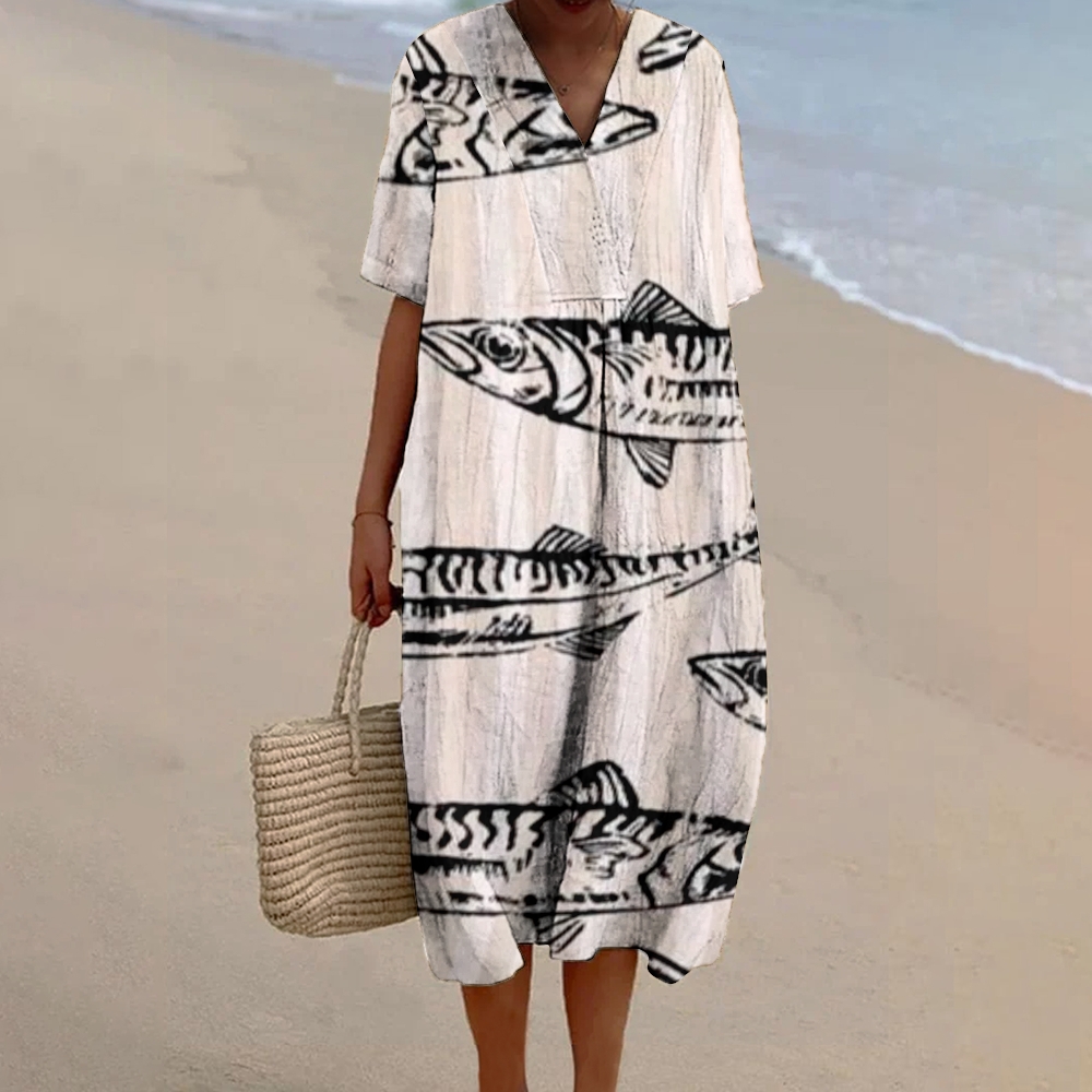 Women's Striped Fish Print Flowy Dress