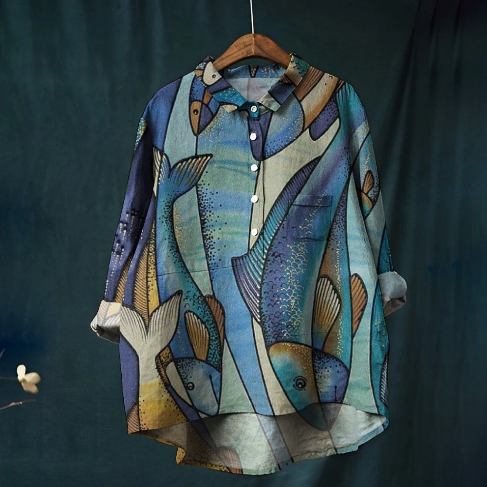 Women's Colorblock Fish Art Print Casual Shirt