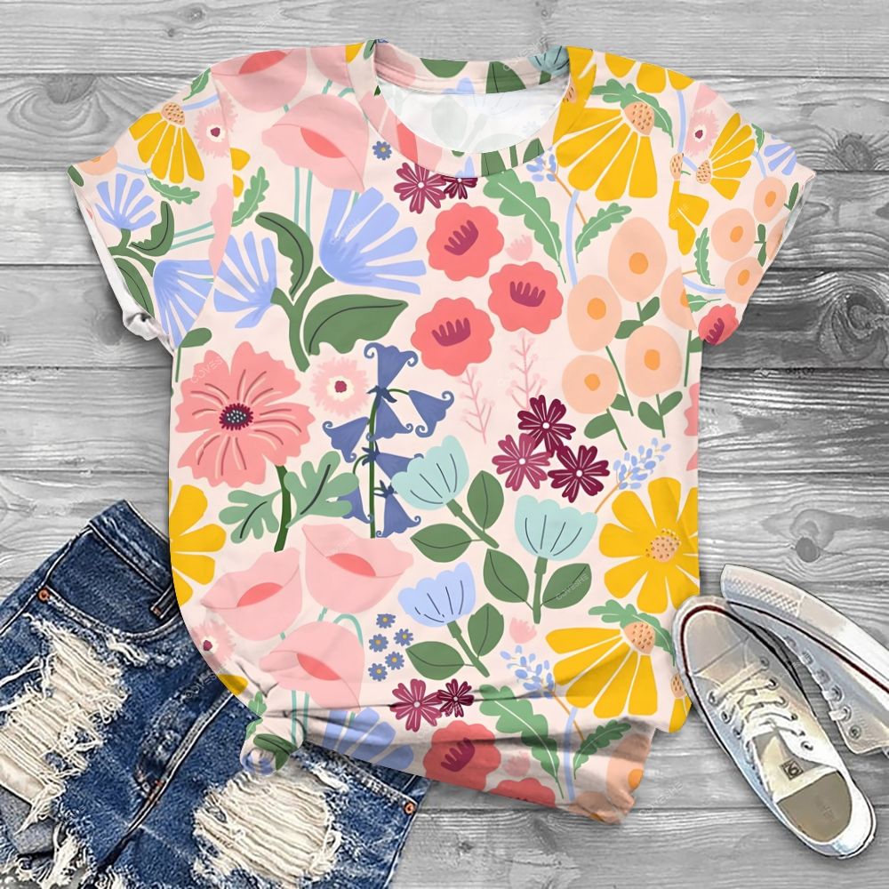 Women's Cute Flowers Printed Round Neck T-Shirt