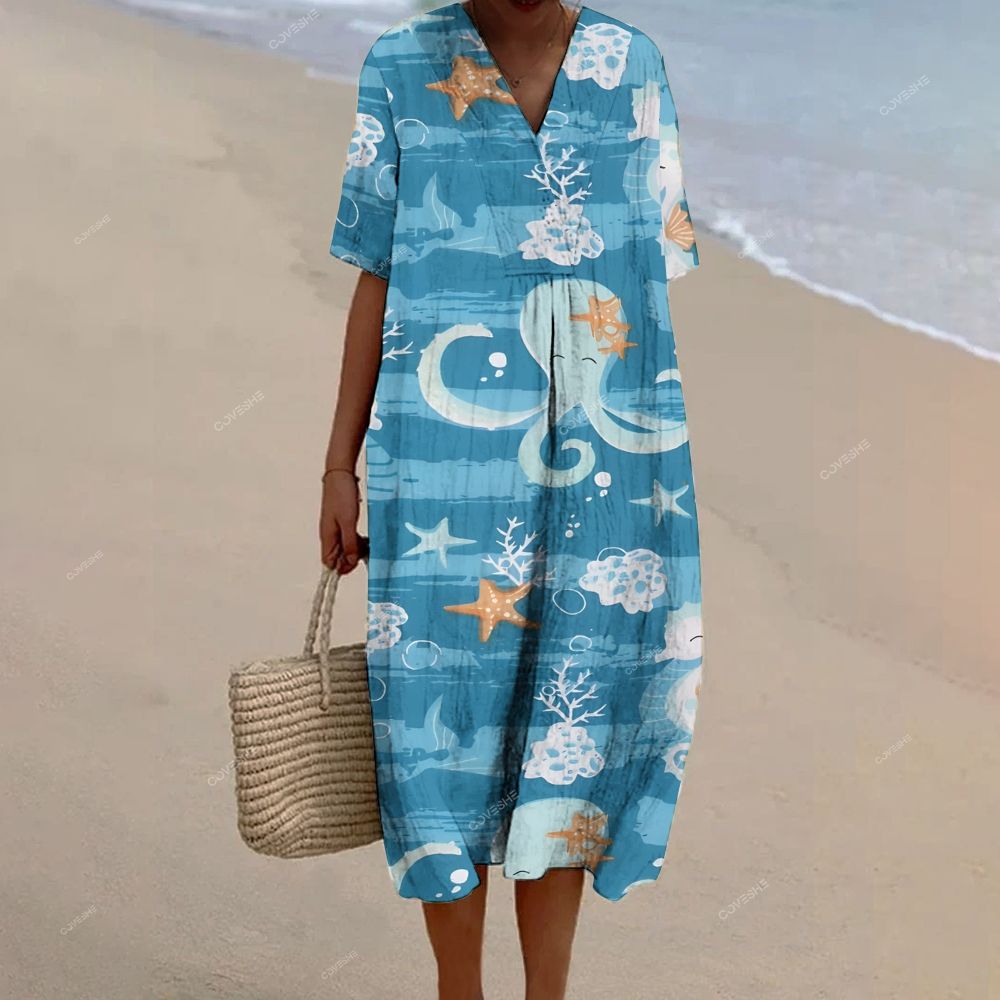Women's Cartoon Octopus Starfish Printed Flowy Dress