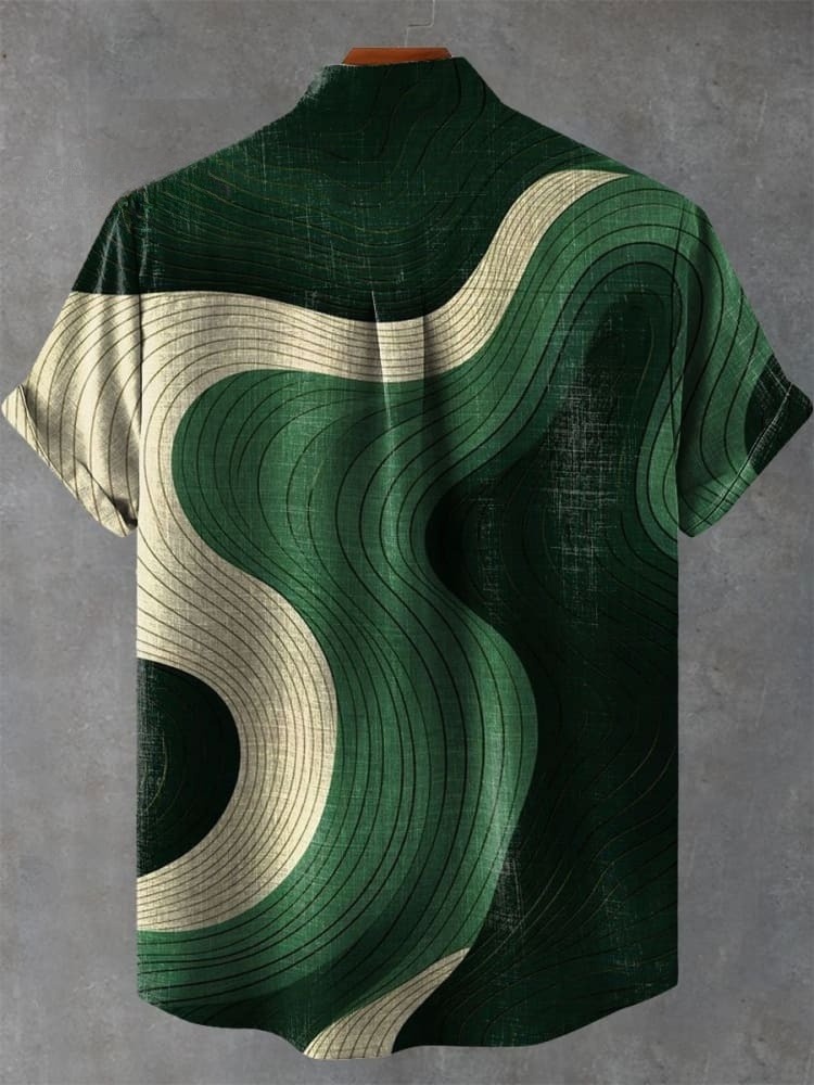 Vintage Green Color Block Wave Art Print Casual Shirt
