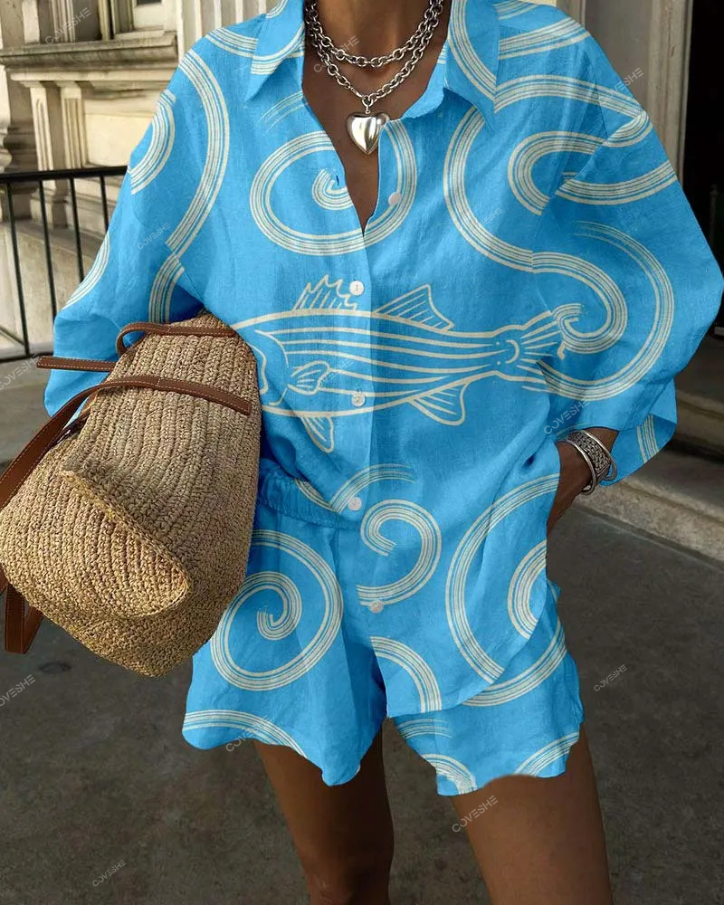 Fun Striped Fish Print Casual Two-Piece Set
