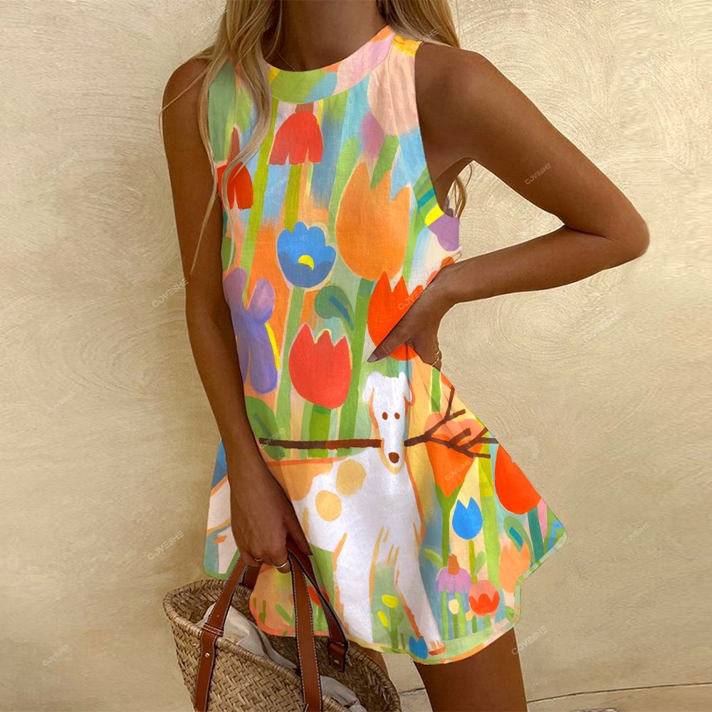 Women's Sleeveless Cartoon Colorful Dog Printed Dress