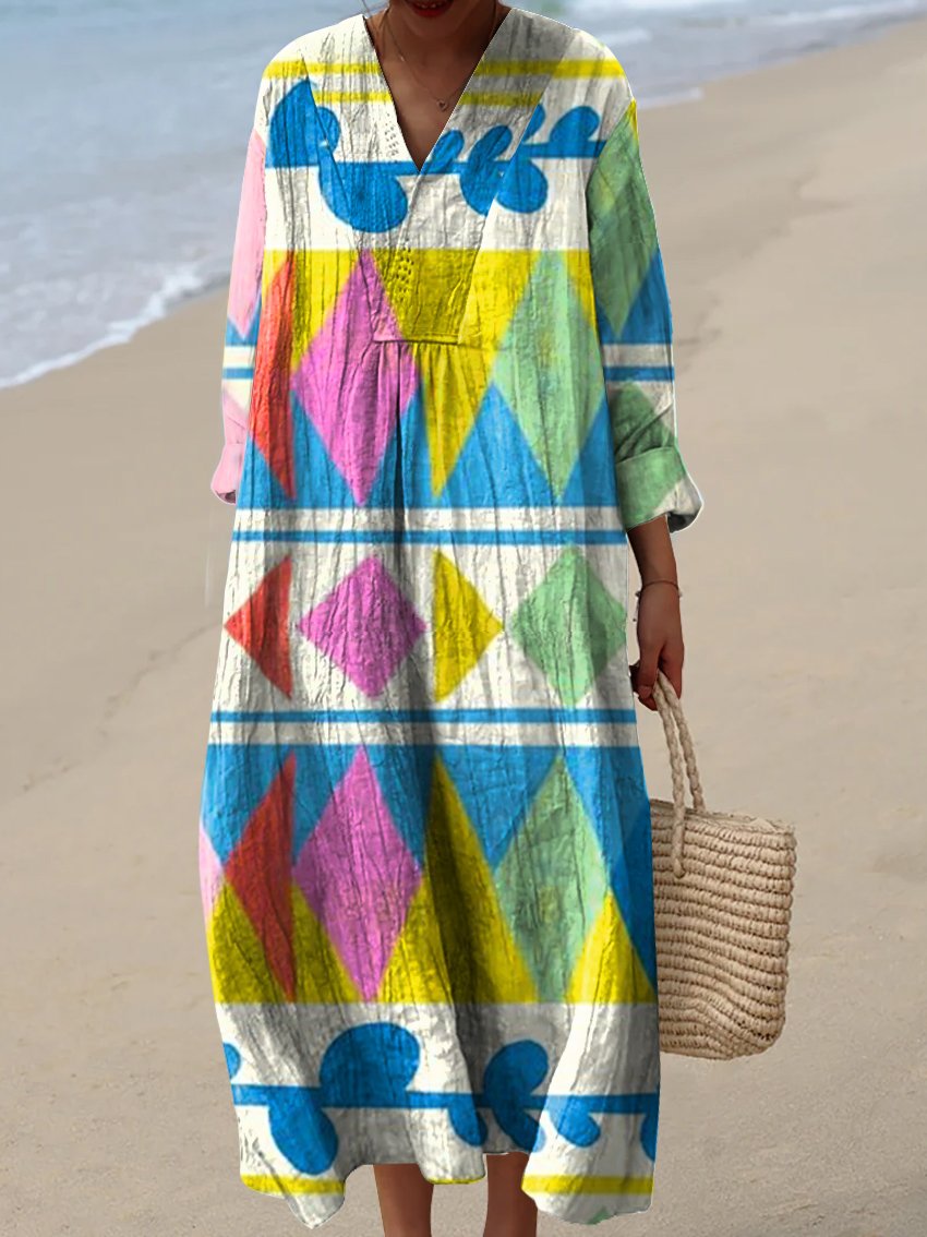 Women's Vintage Abstract Color Block Art Print Flowy Dress