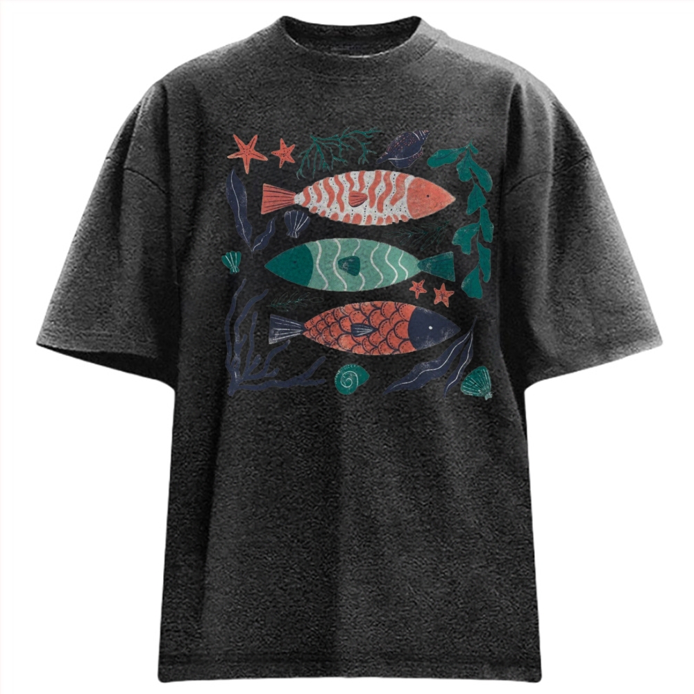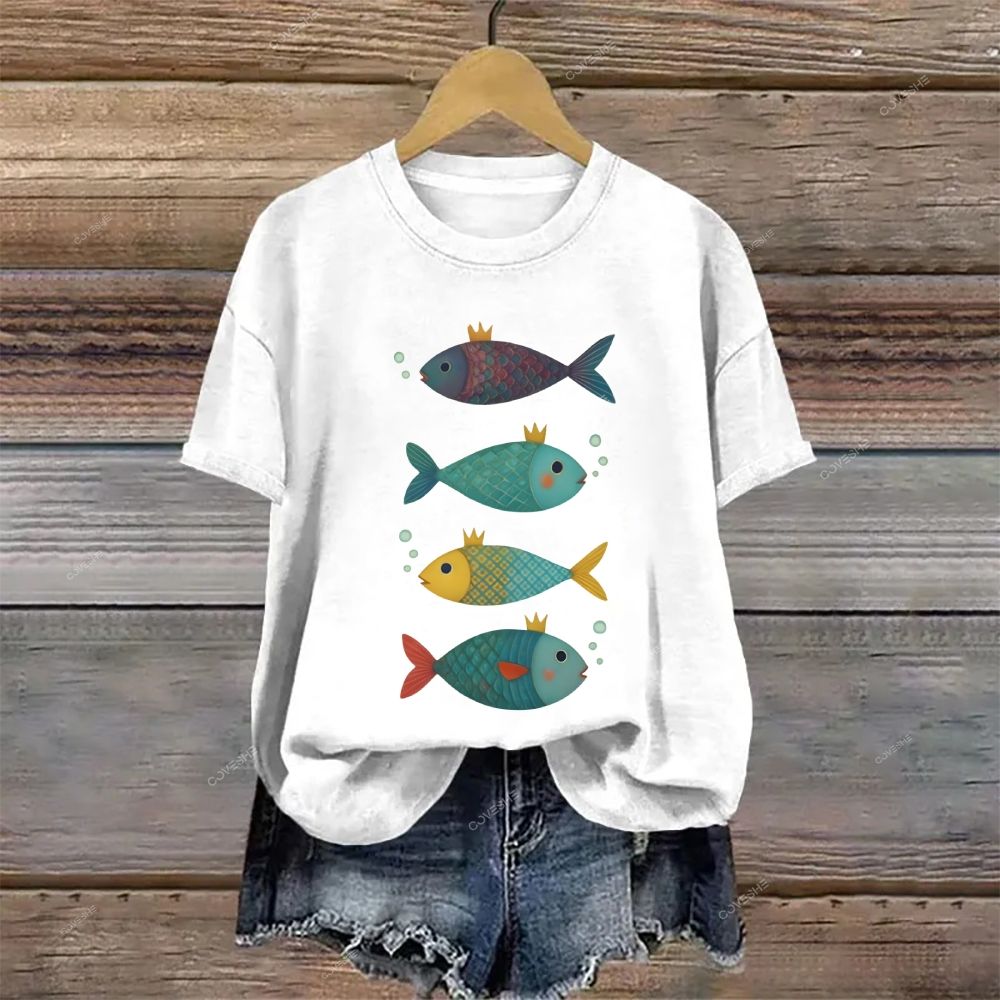 Crew Neck Colorful Cartoon Fish Printed Casual Cotton T-shirt