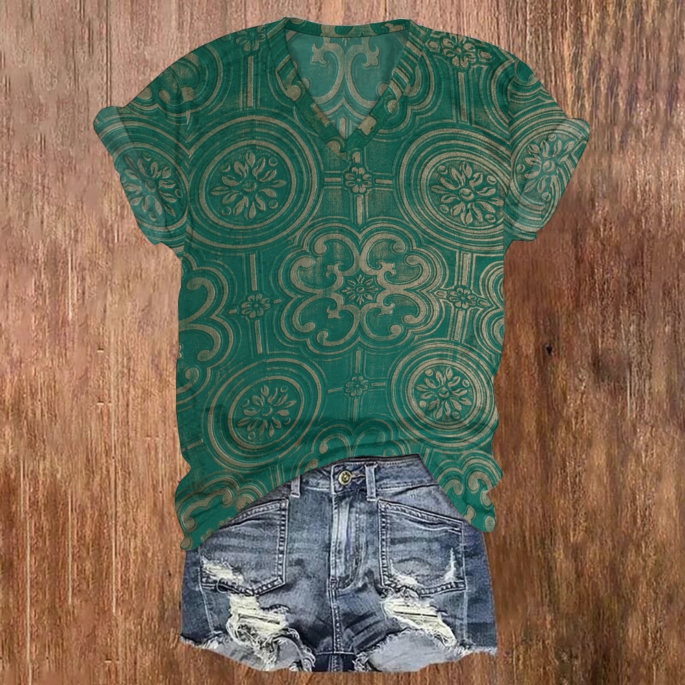Women's V-neck Vintage Printed Short Sleeve T-shirt