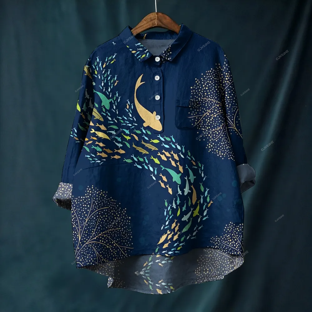 Women's Cartoon Geometric Fish Printed Casual Long Sleeve Shirt