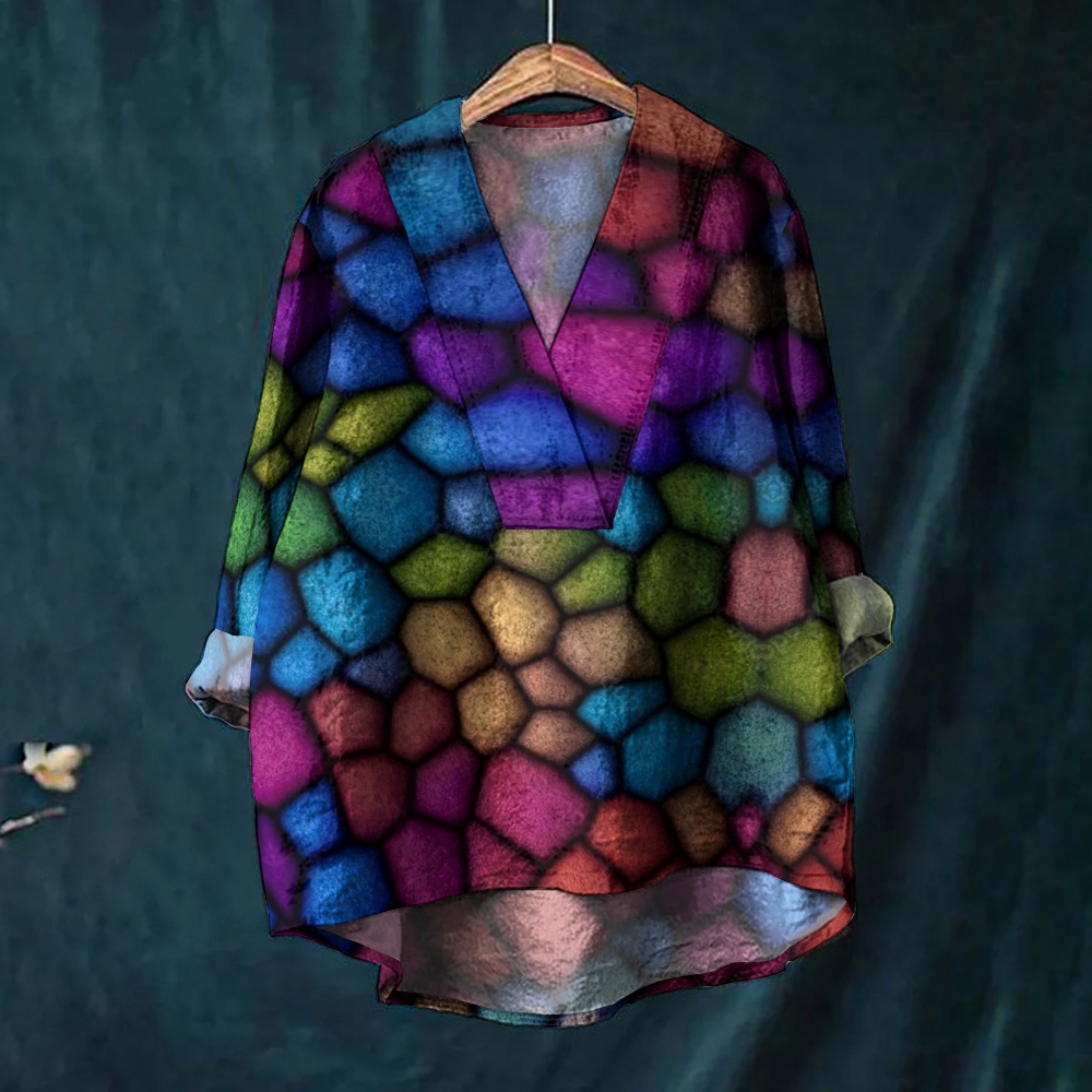 Women's Vintage Colorful Geometry Print Casual V-neck Shirt