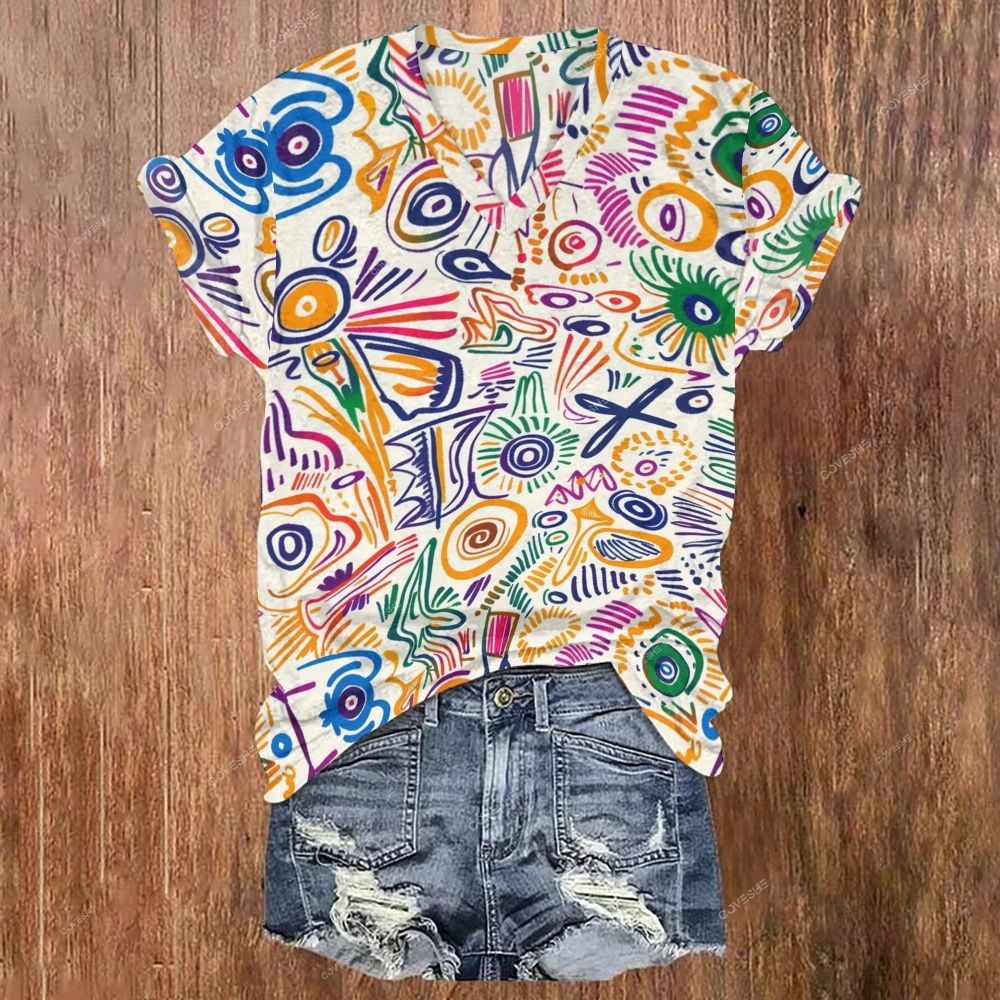 Women's V-neck Colorful Art Geometry Printed Short Sleeve T-shirt