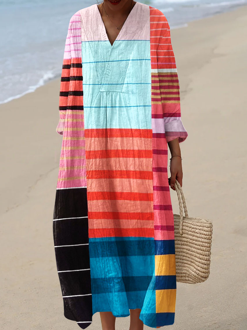 Women's Vintage Abstract Geometric Color Block Line Art Print Dress