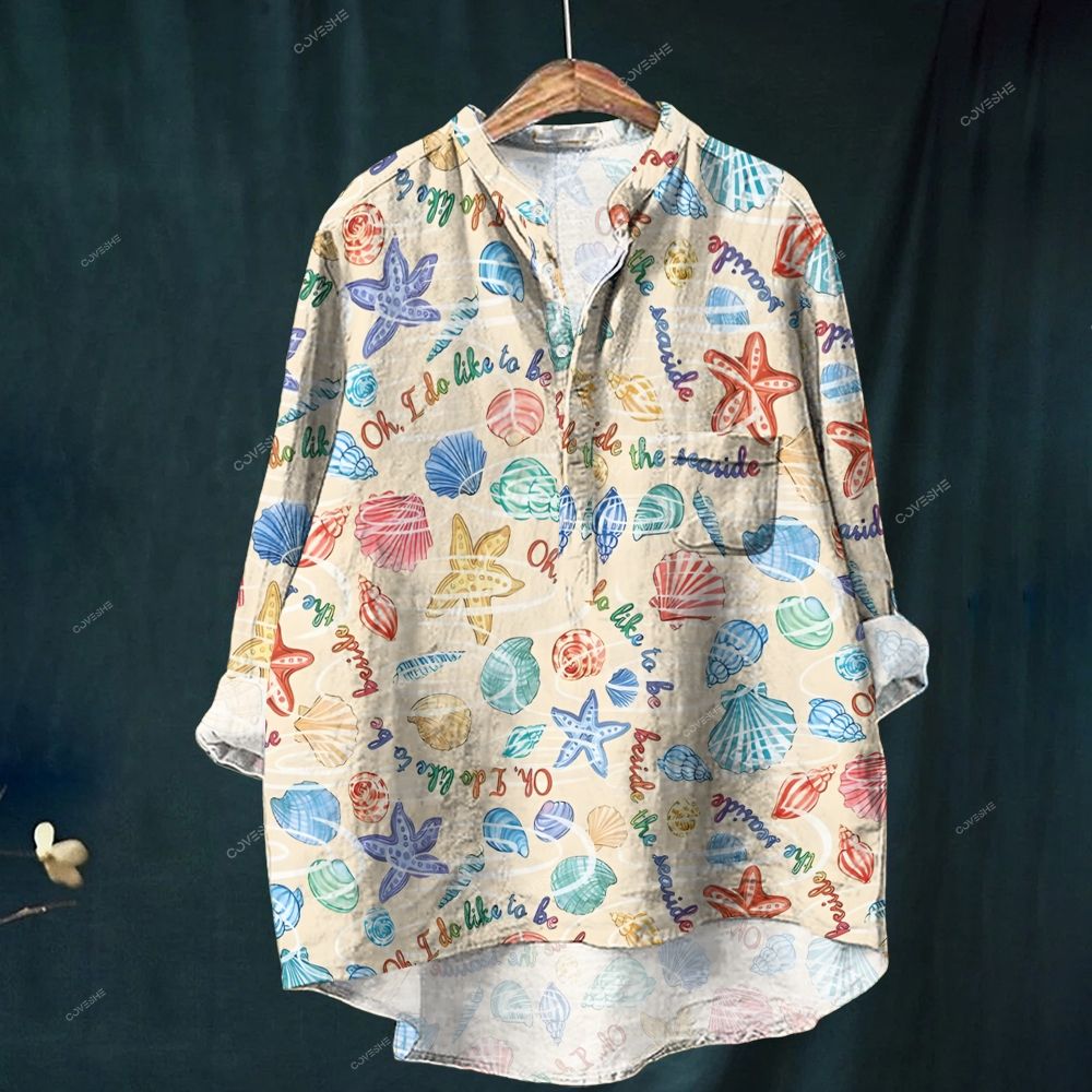 Women's Colorful Cartoon Shell Starfish Printed Stand Collar Casual Shirt