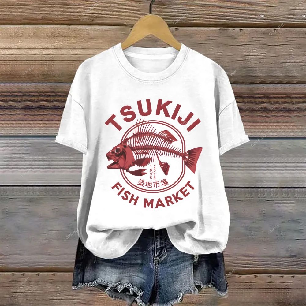 Crew Neck Tsukiji Fish Market Printed Casual Cotton T-shirt