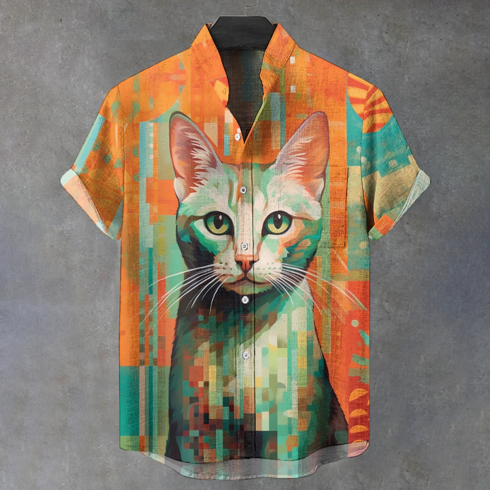 Men's Stand Collar Retro Cat Art Printed Short Sleeve Shirt