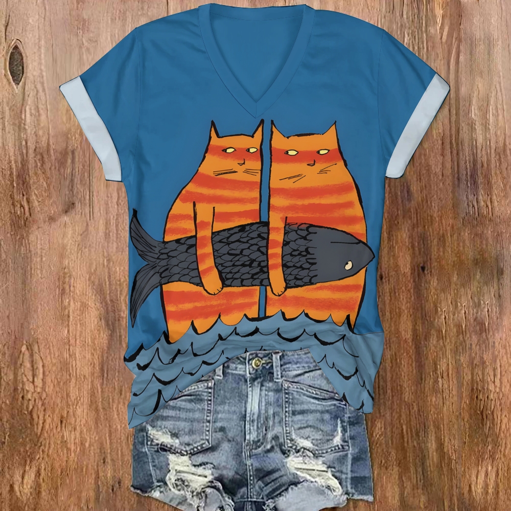 V-neck Cat And Fish Printed Casual T-shirt