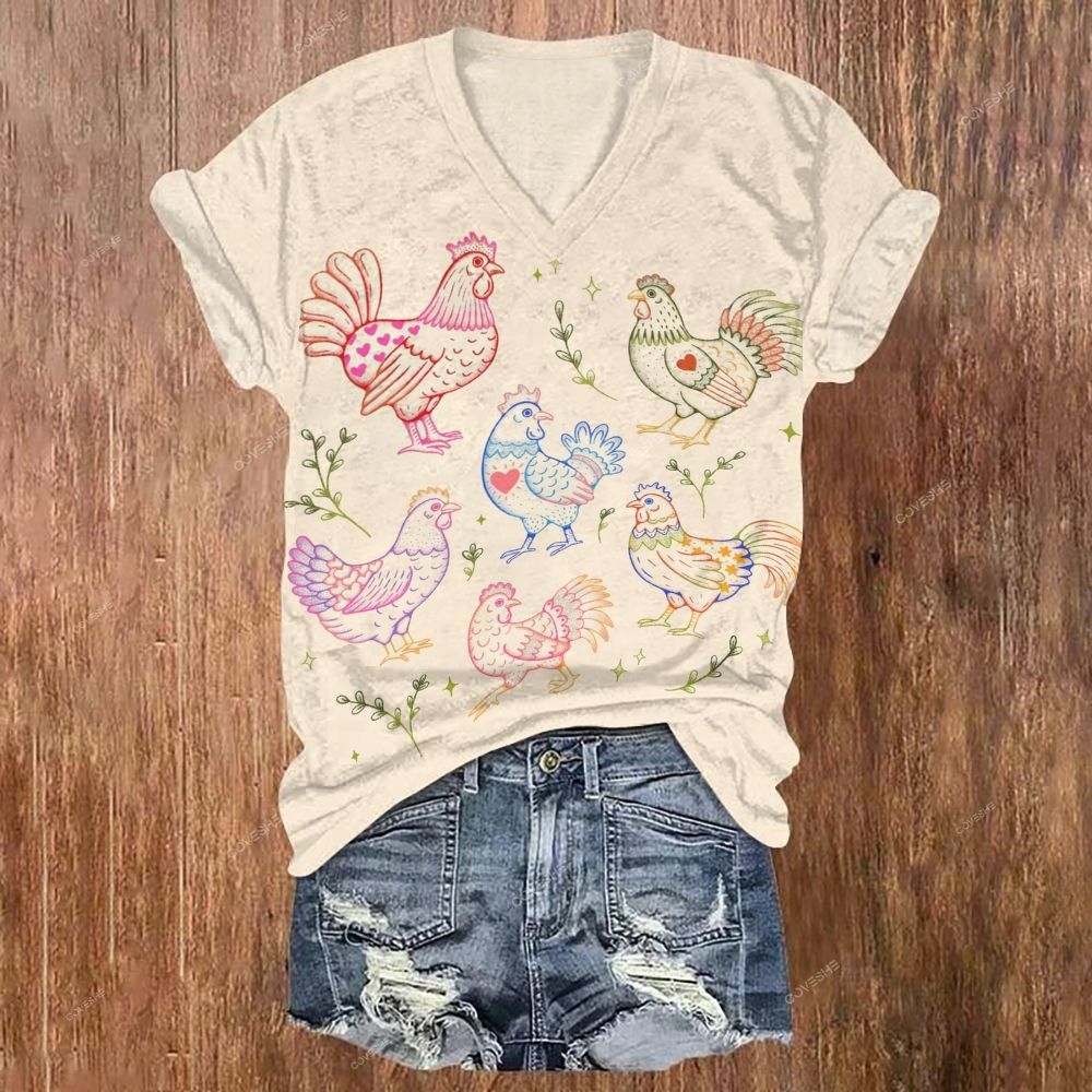 Women's V-neck Art Color Cartoon Chicken Printed Short Sleeve T-shirt