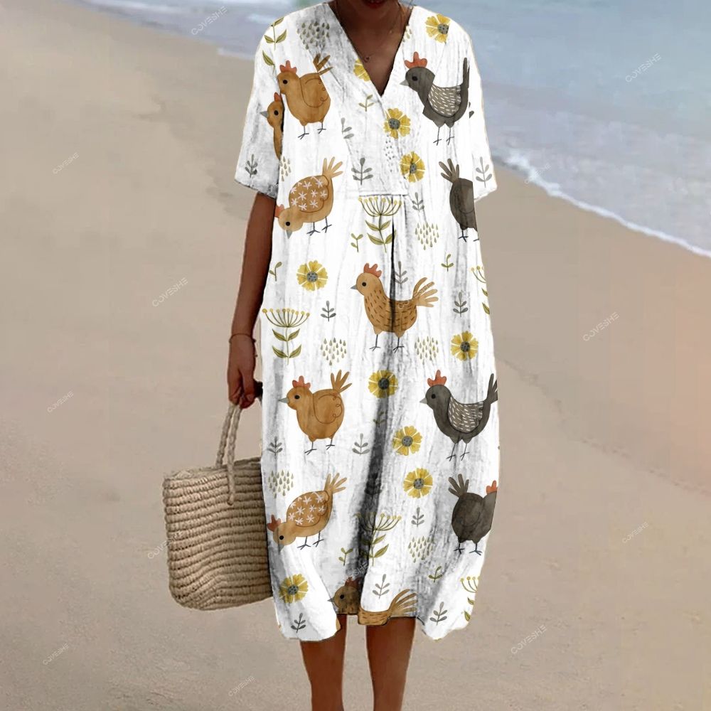 Women's Flower Cartoon Chicken Printed Flowy Dress