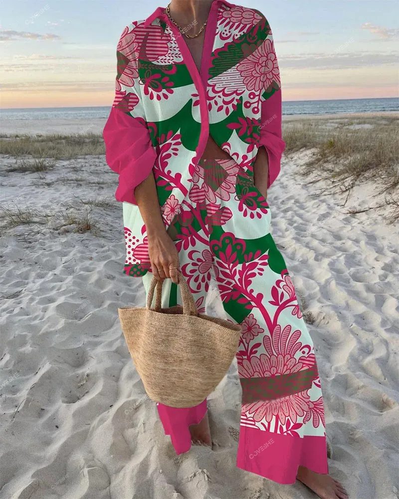 Vacation Style Pink Flower Print Shirt & Pants Two-Piece Set