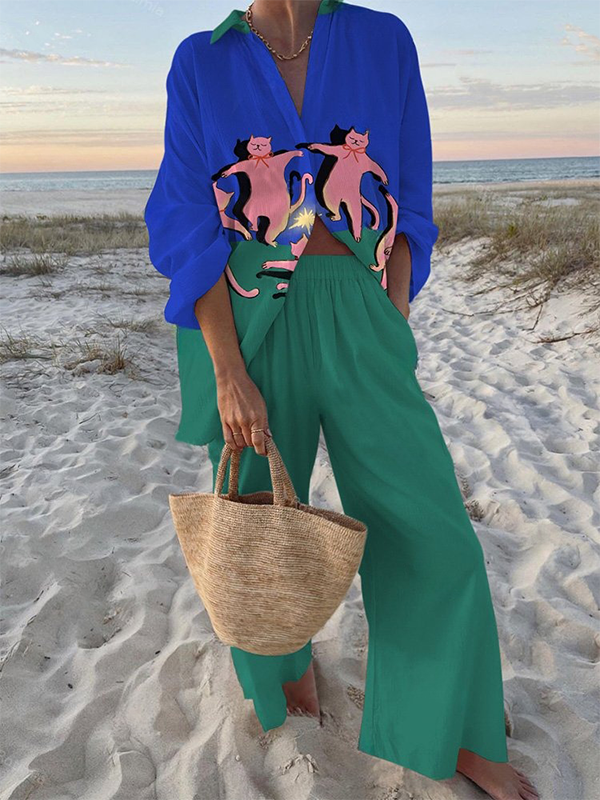 Dancing Cat Print Long Sleeve Trousers Two-Piece Set