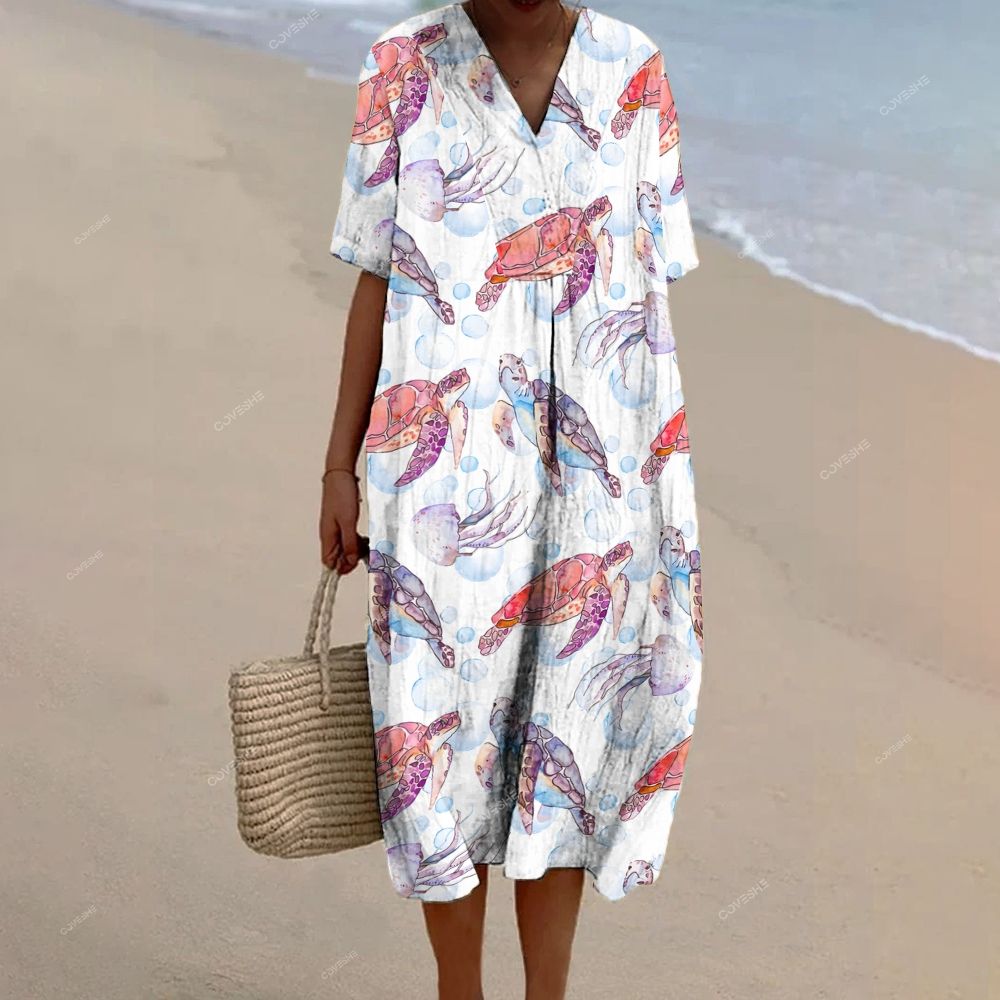 Women's Cartoon Turtle Jellyfish Printed Flowy Dress