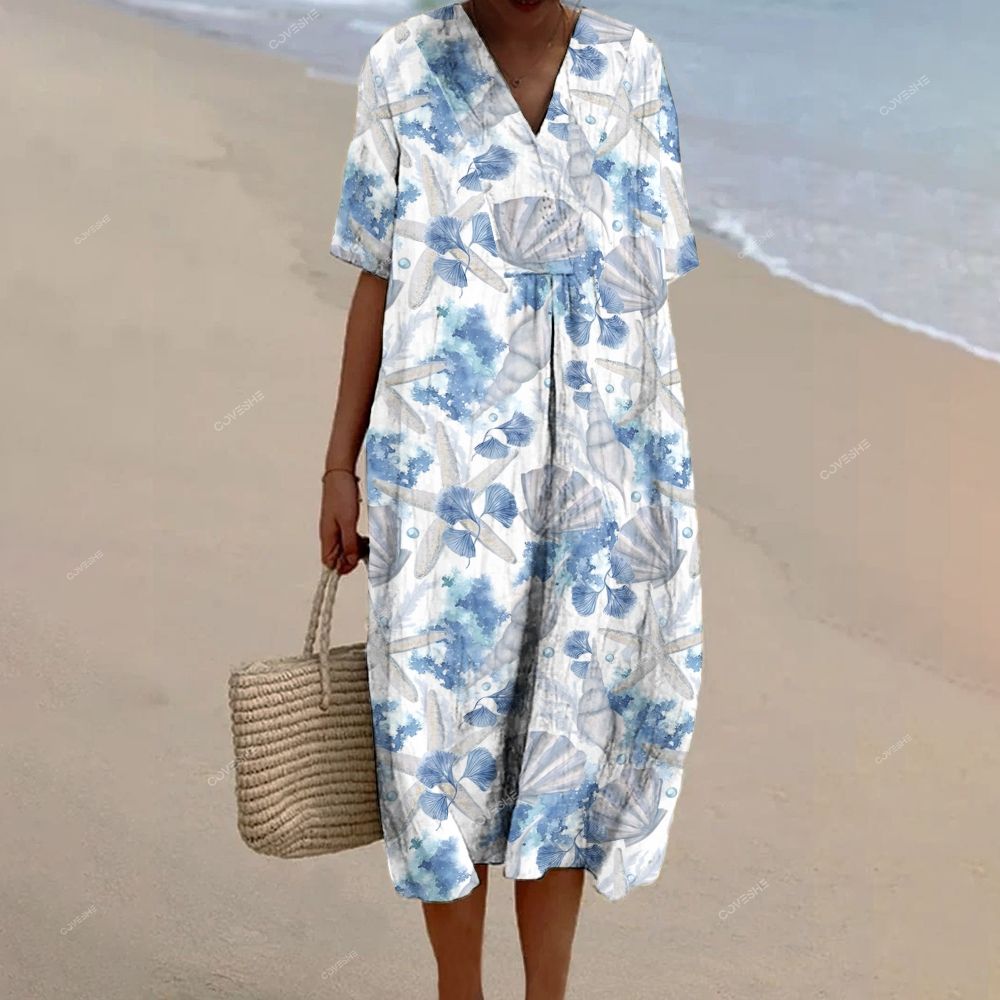 Women's Vintage Shell and Starfish Art Print Casual V-neck Shirt
