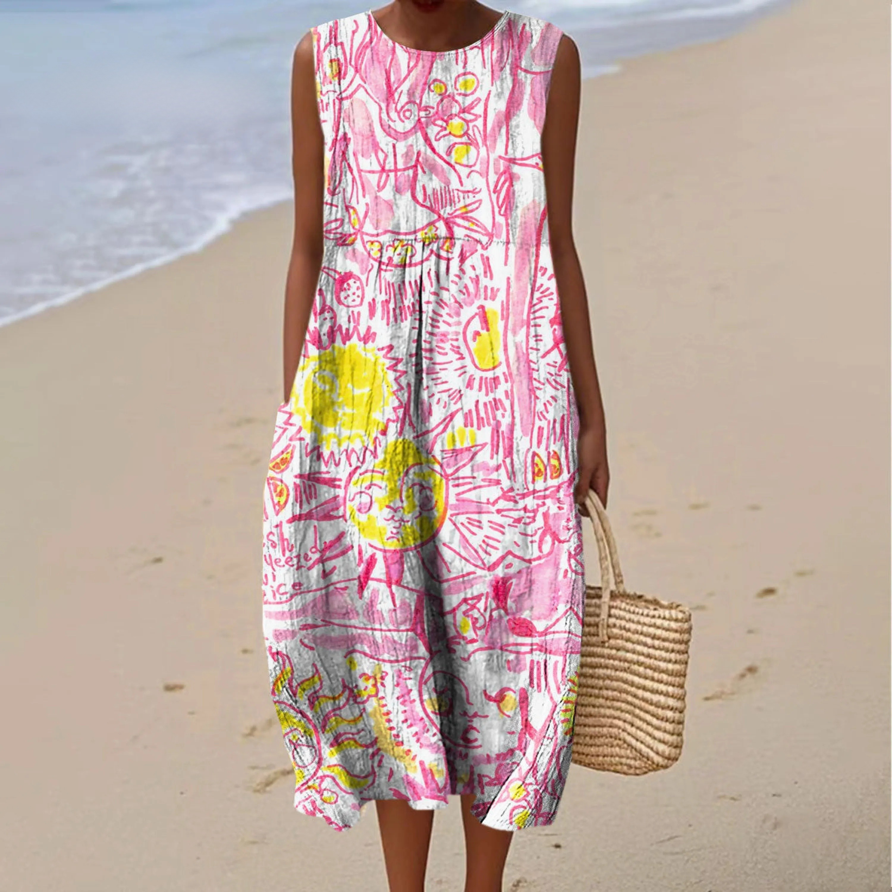 Women's Colorful Abstract Graffiti Art Print Sleeveless Cotton Pocket Wrap Dress