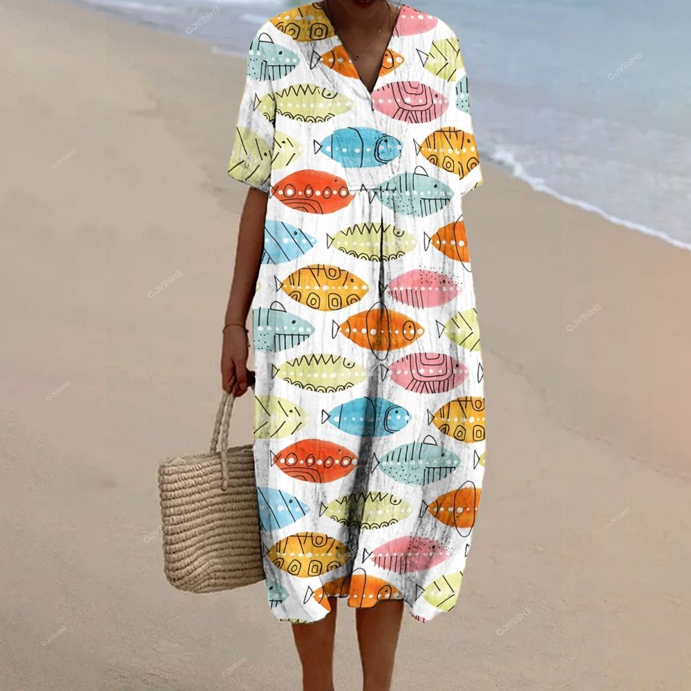 Women's Colorful Cartoon Fish Printed Flowy Dress