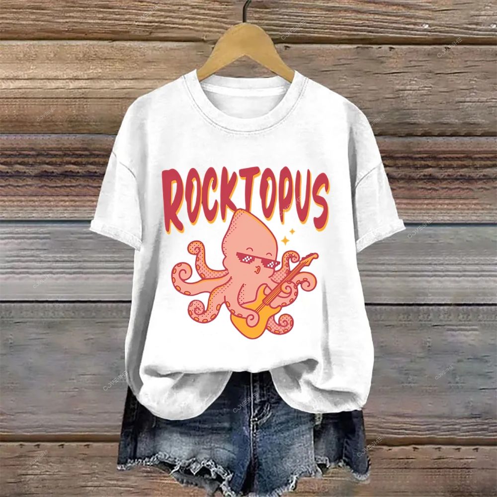 Crew Neck Casual Rocktopus Printed Cotton T-shirt