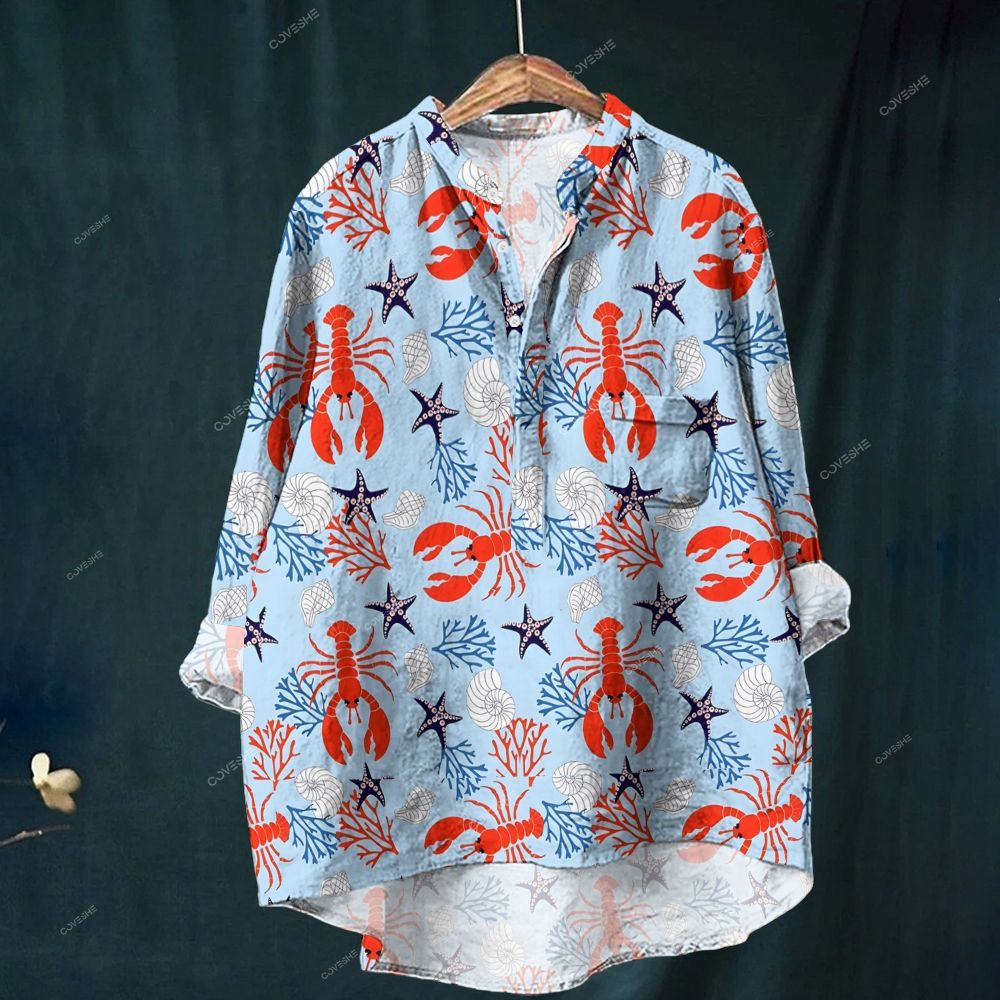 Women's Coral Lobster Printed Stand Collar Casual Shirt