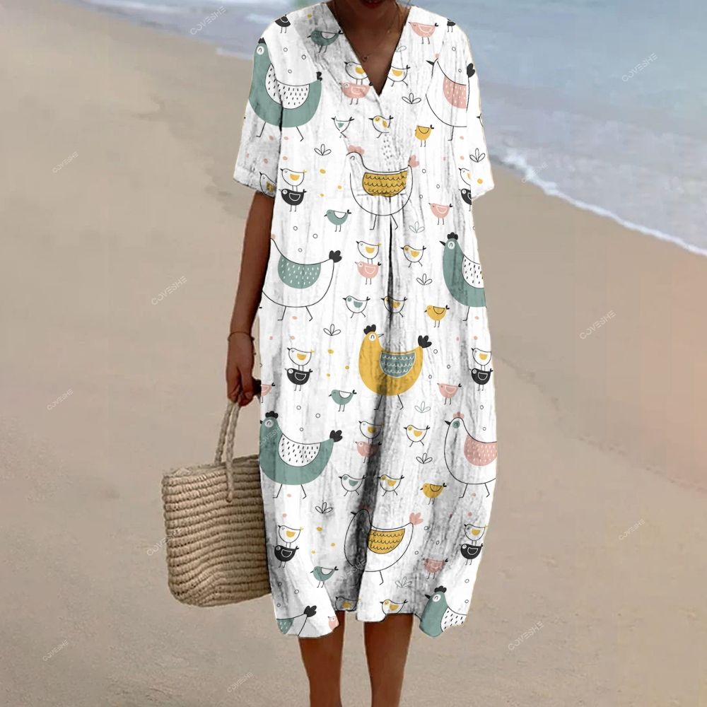 Women's Flower Cartoon Chicken Printed Flowy Dress