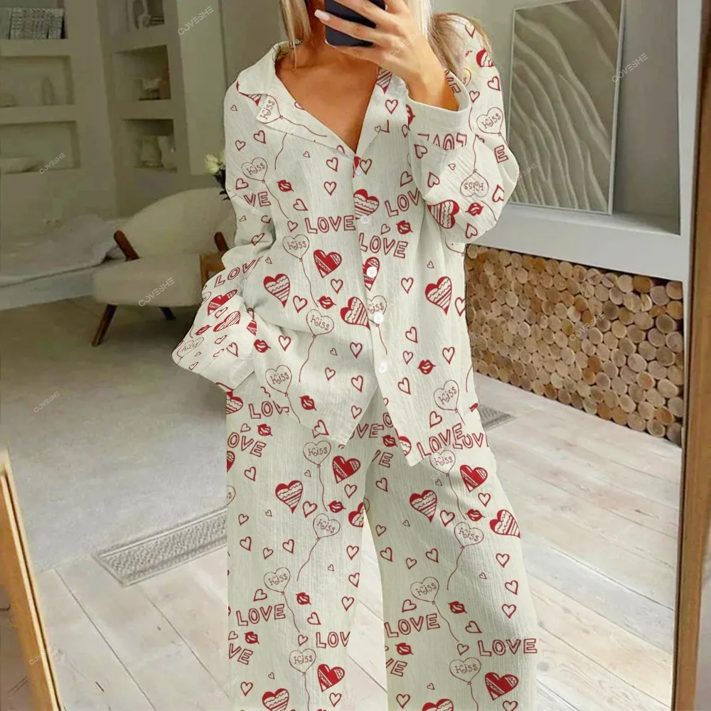 Women's Heart Love Printed Cotton Cardigan Homewear Set