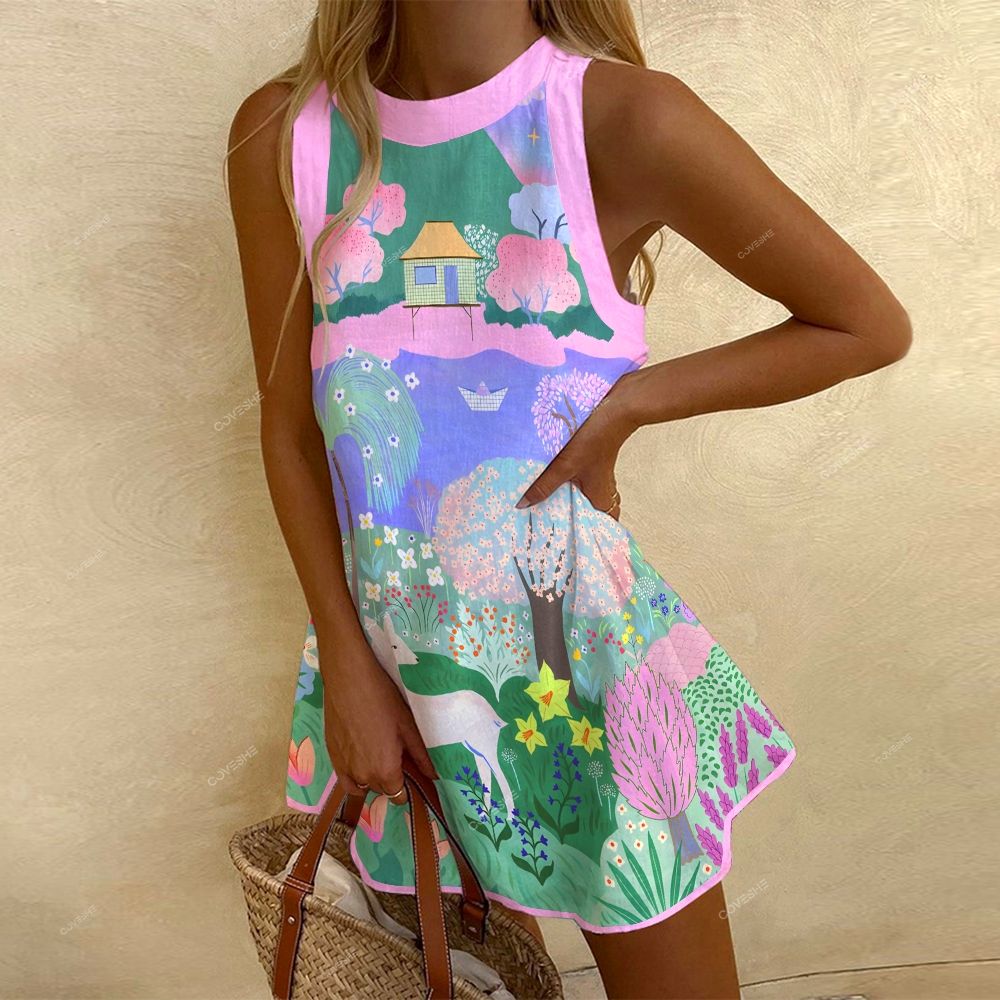 Women's Sleeveless Flower Trees Printed Dress