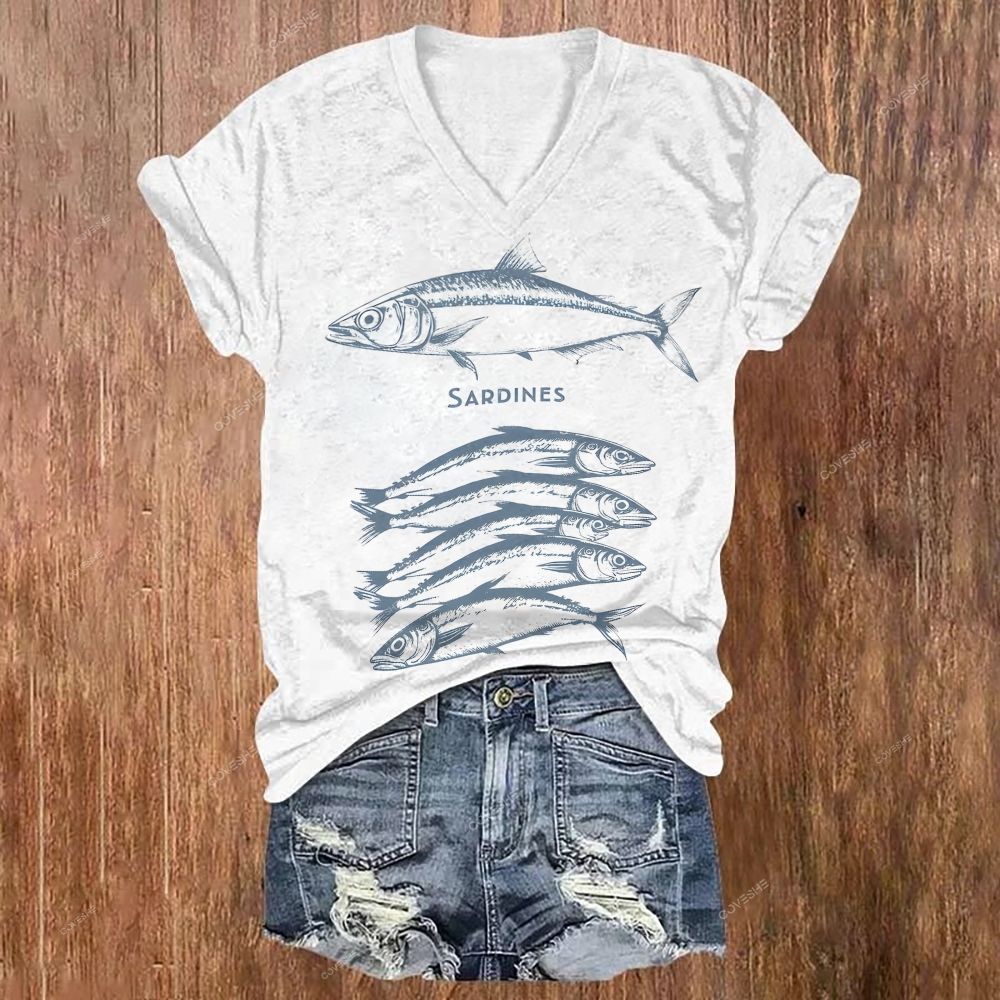 Women's V-neck Sardines Printed Short Sleeve T-shirt
