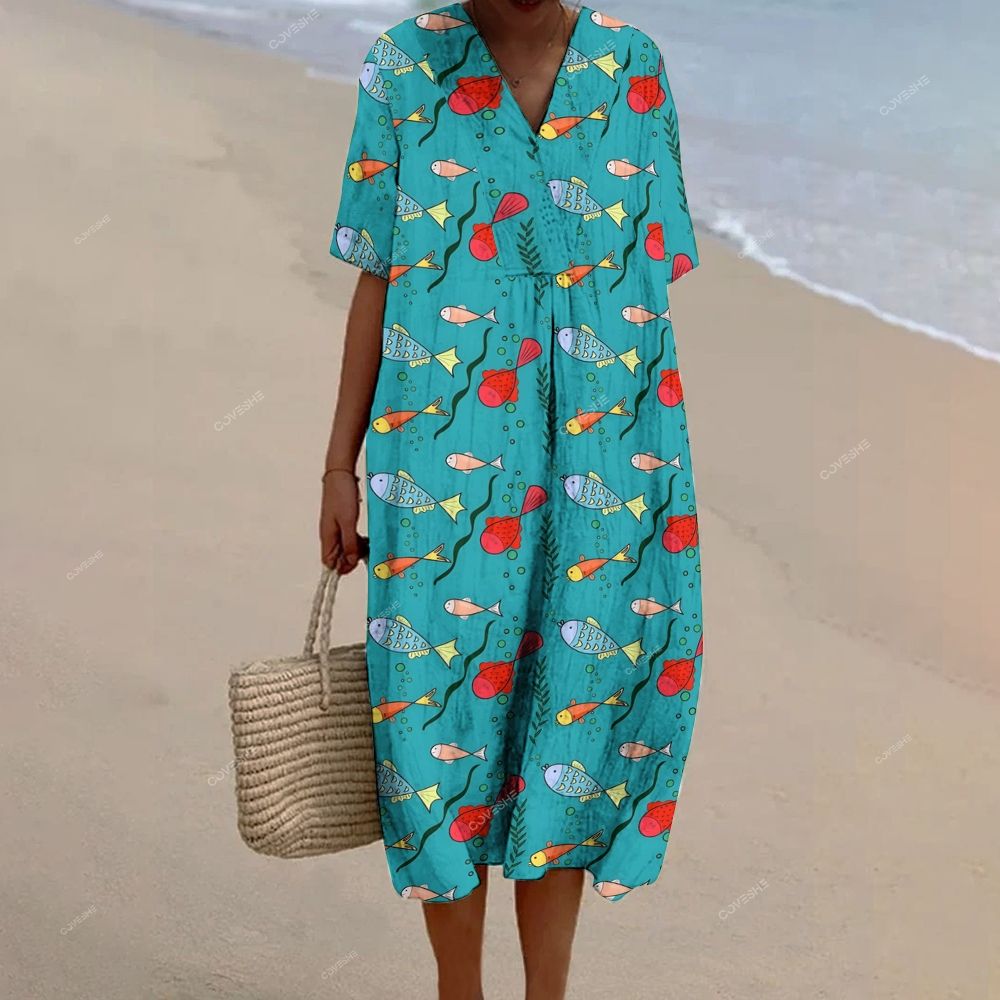 Women's Colorful Cartoon Fish Printed Flowy Dress