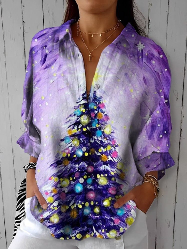 Purple Christmas Tree Printing Cotton And Linen Shirt