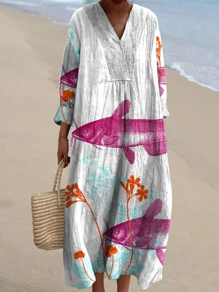 Women's Vintage Lovely Fish Art Print Flowy Dress