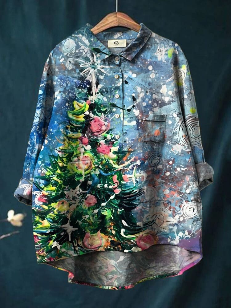 Funny Christmas Tree Printing Cotton And Linen Shirt