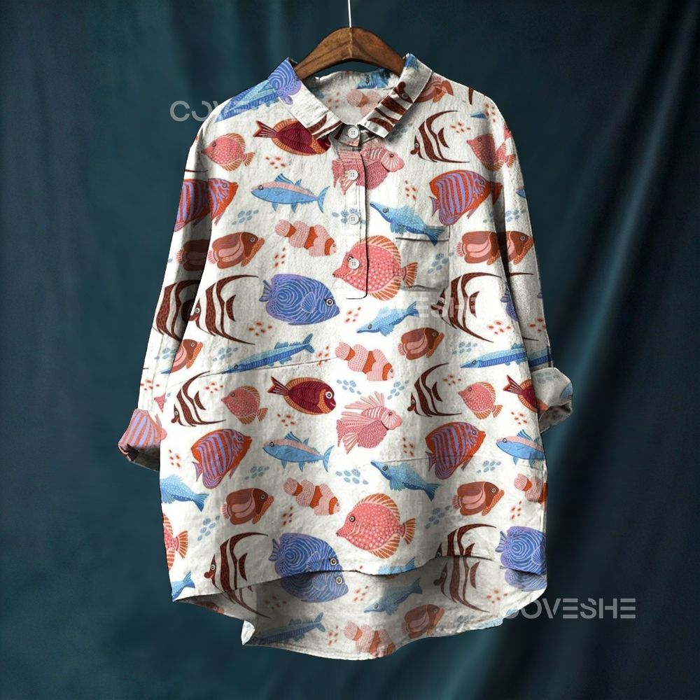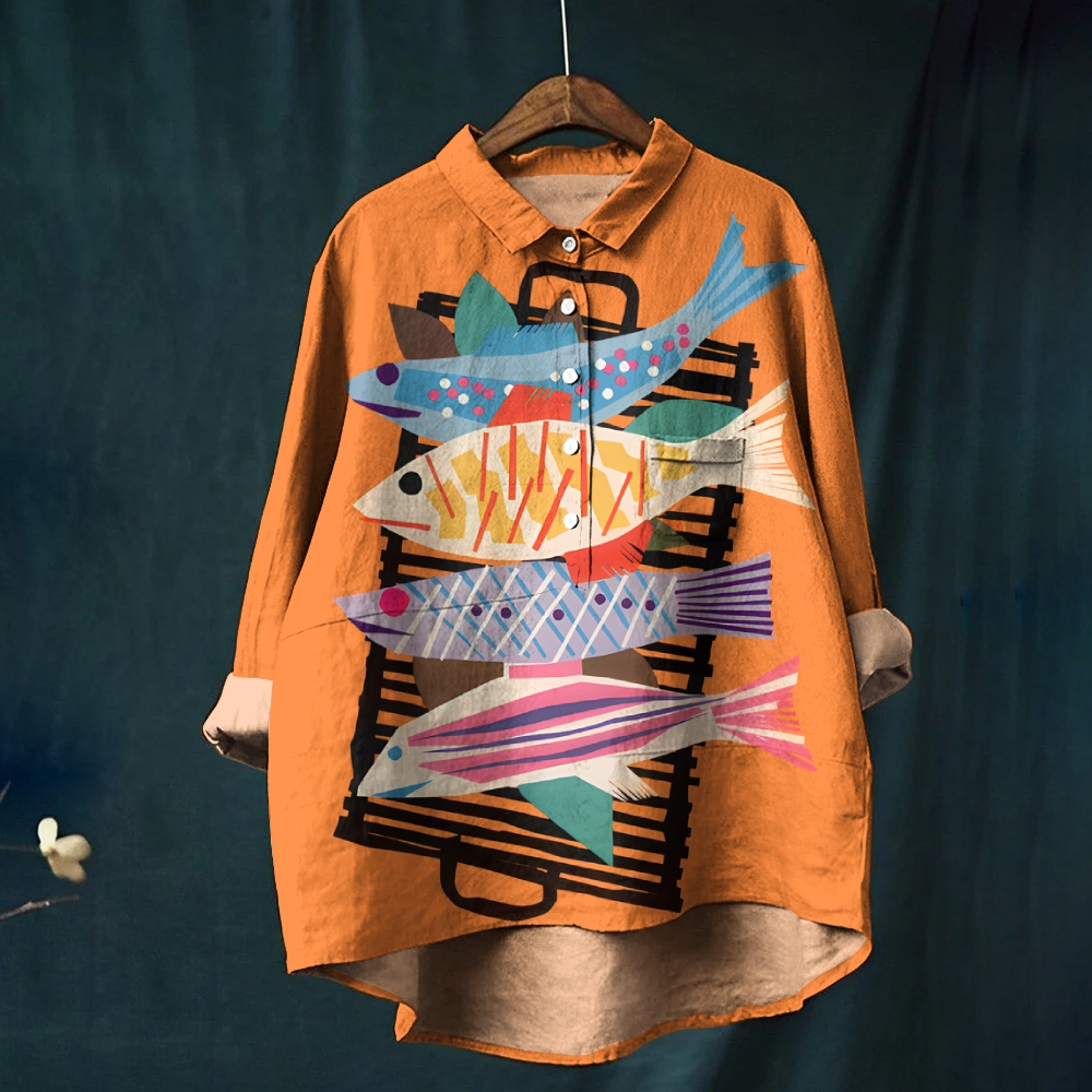 Women's Colorful Cartoon Fish Printed Casual Long Sleeve Shirt