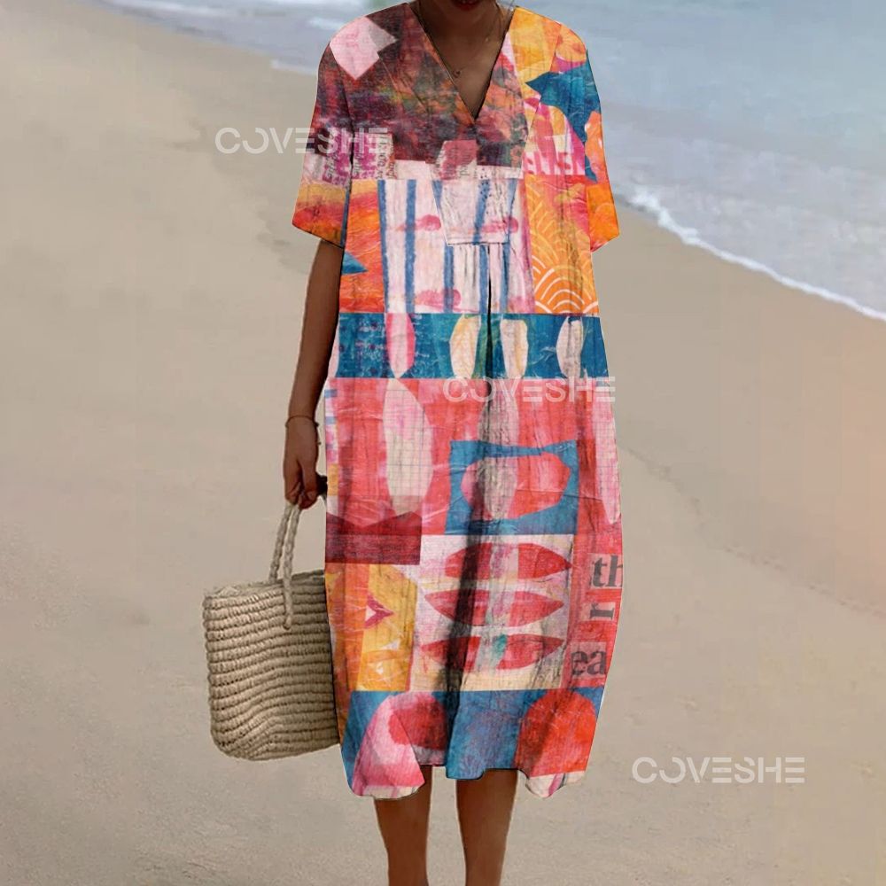 Women's Artistic Geometric Splicing Printed Flowy Dress