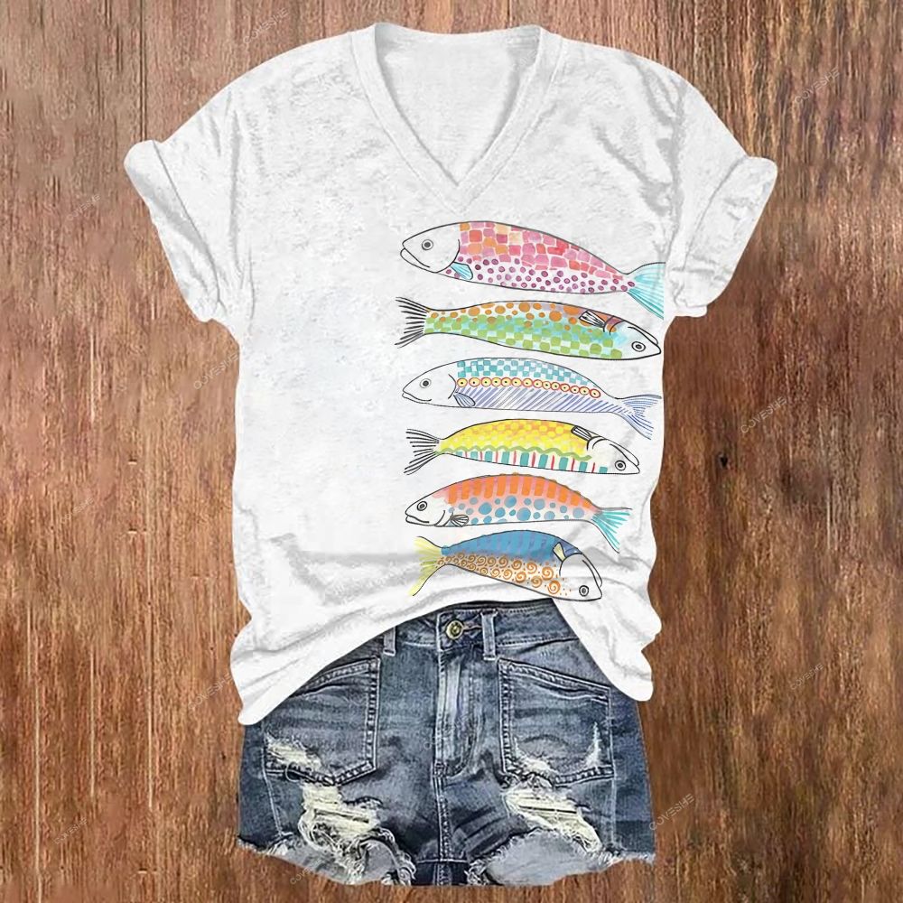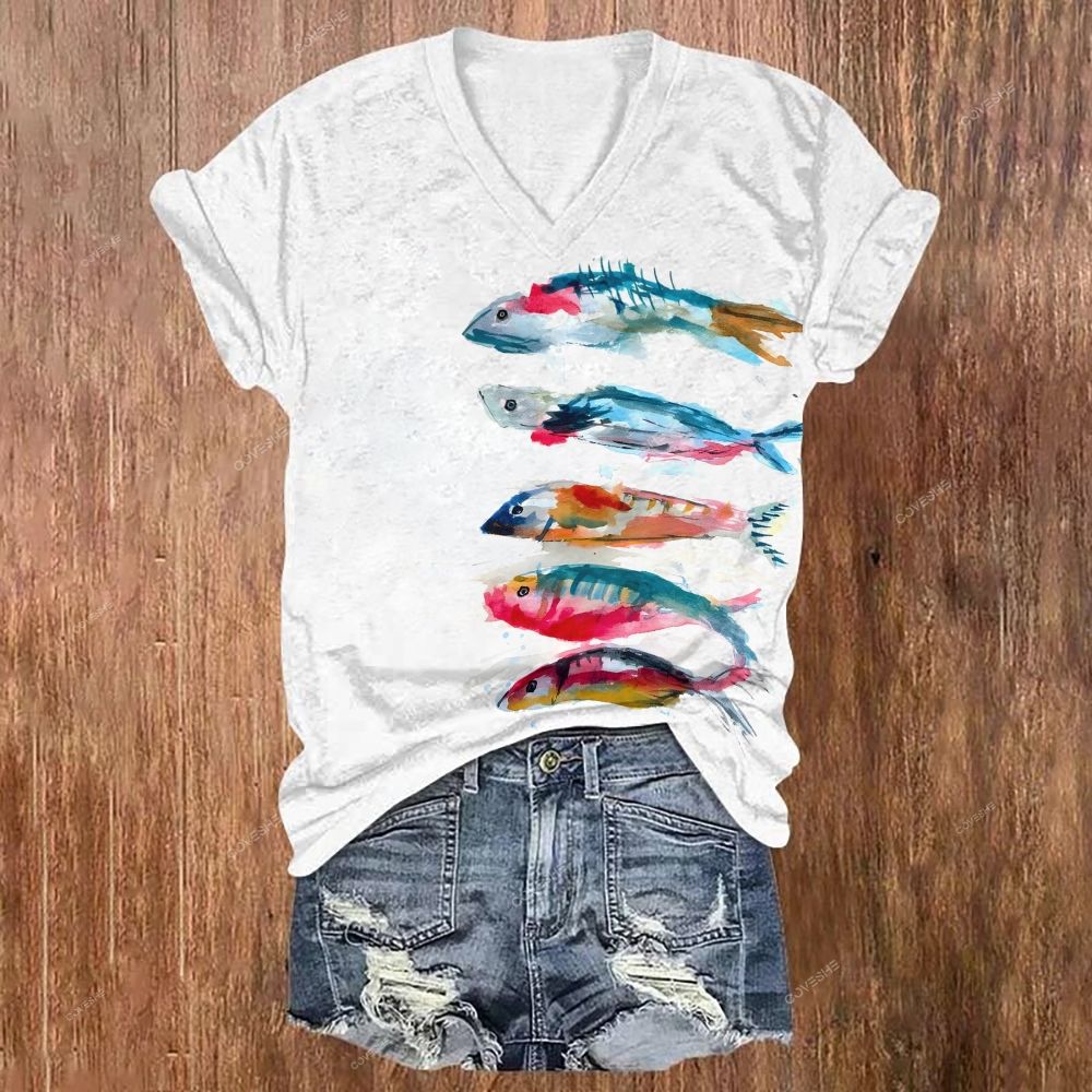 Women's V-neck Colorful Art Fish Printed Short Sleeve T-shirt