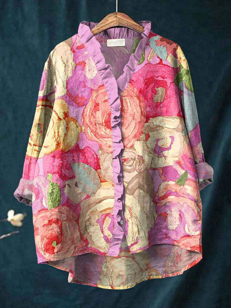 Women's Beautiful Colorful Large Rose Painting Art Print Casual Ruffle Shirt
