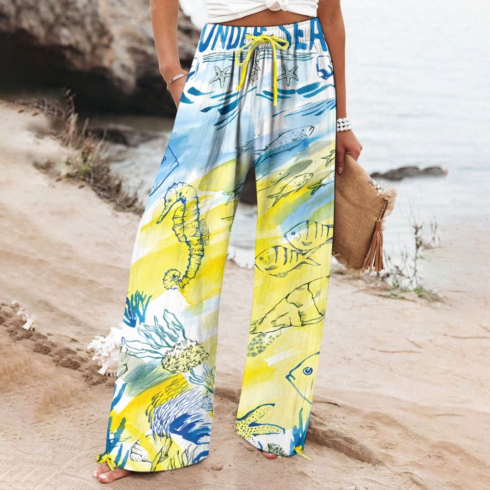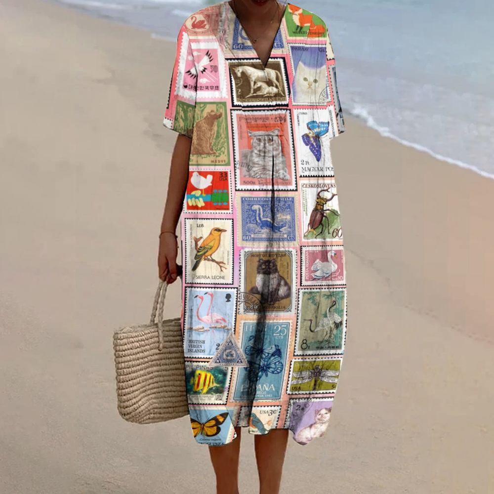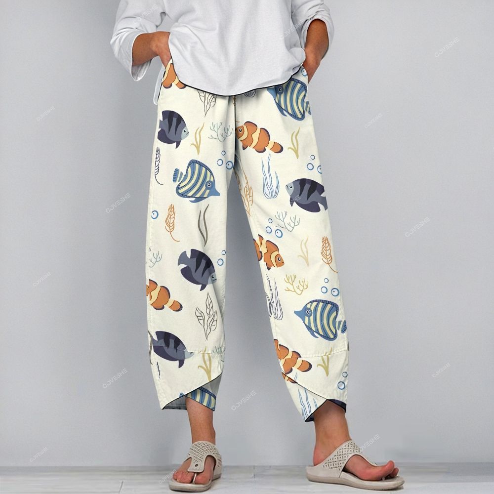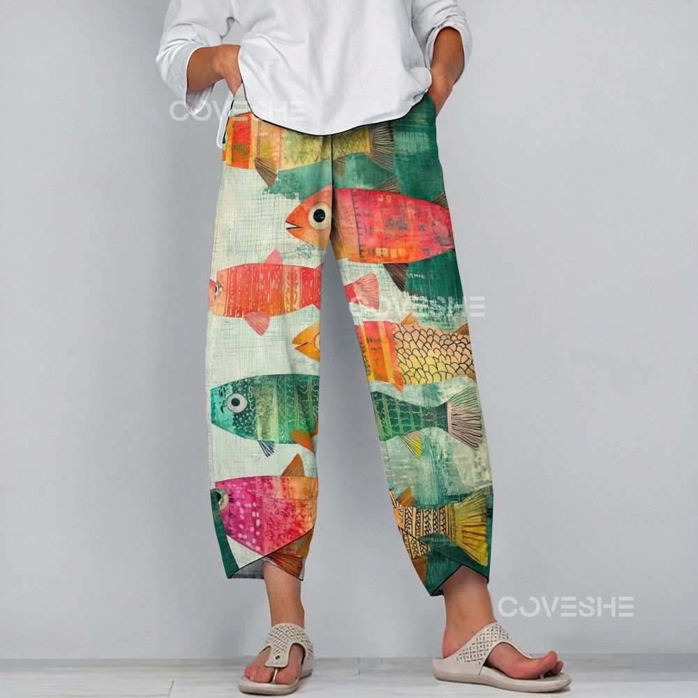 Women's Vintage Abstract Marine Life Fish Art Print Flowy Dress