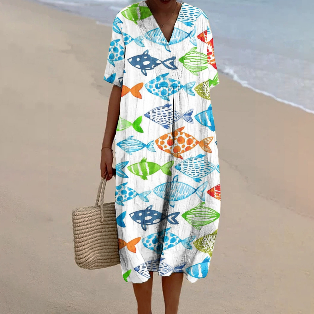 Women's Fish Vintage Art Print Sleeveless Cotton Pocket Wrap Dress