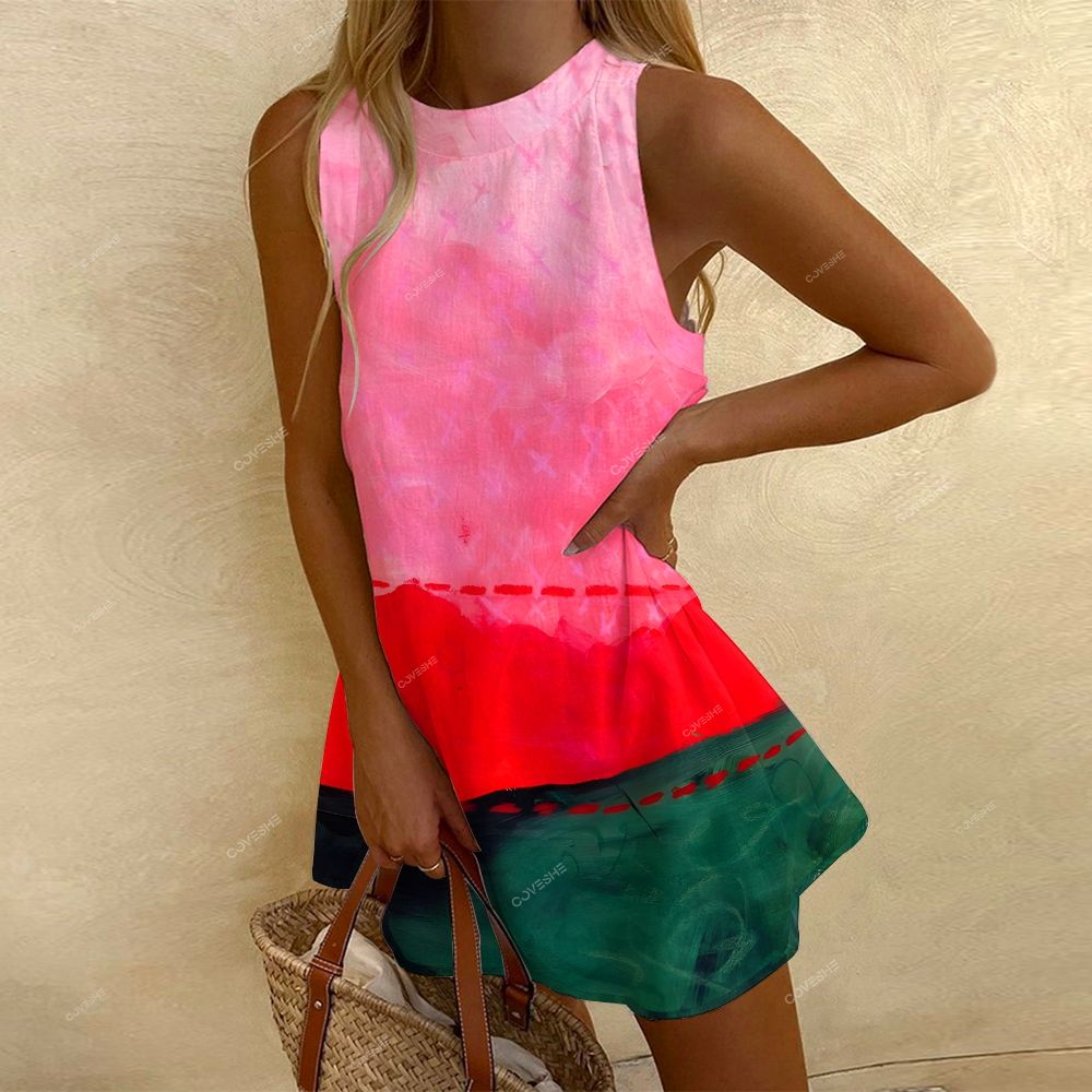 Women's Three-color Color-block Abstract Geometric Stripes Watercolor Splash Fluid Art Print Flowy Dress