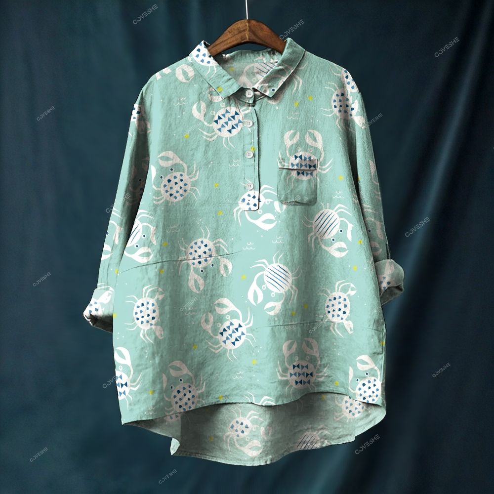 Women's Cartoon Crab Printed Casual Long Sleeve Shirt