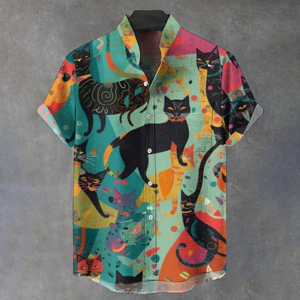 Men's Stand Collar Retro Abstract Cat Printed Short Sleeve Shirt
