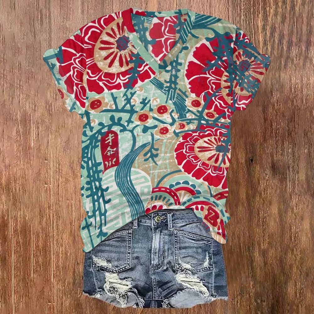 Women's V-neck Japanese Style Flower Printed Short Sleeve T-shirt
