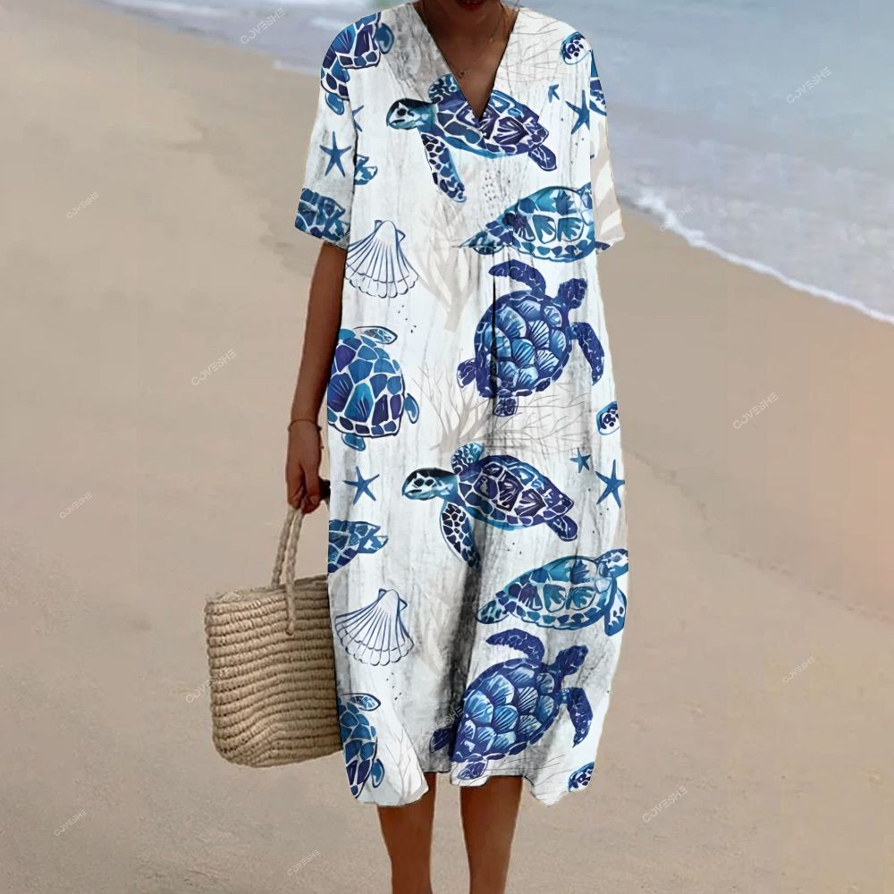 Women's Turtle Starfish Printed Flowy Dress